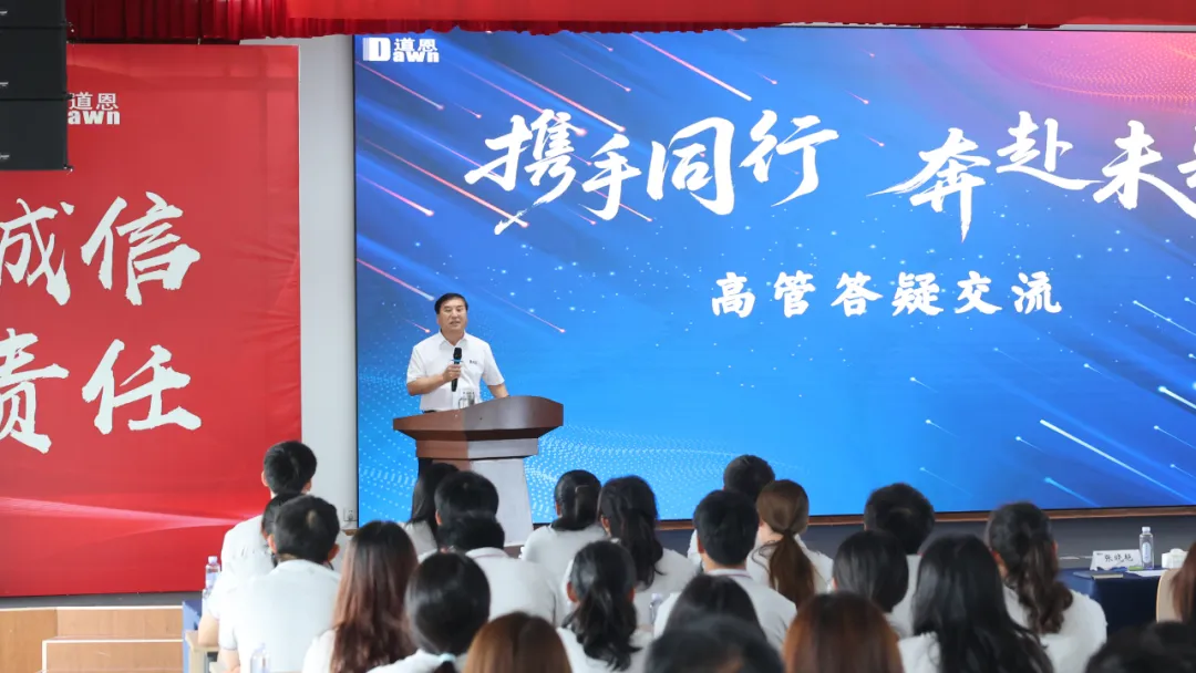 “34年前,我與你們年齡相仿,帶領(lǐng)5個人的小團(tuán)隊(duì)踏上了創(chuàng)業(yè)征程,一路披荊斬棘,風(fēng)雨兼程,在改革開放的大潮中,搶抓發(fā)展機(jī)遇,帶領(lǐng)道恩完成了從無到有、從小到大、從弱到強(qiáng)的華麗蛻變。”道恩集團(tuán)董事長、總裁于曉寧與新員工分享了創(chuàng)業(yè)歷程,闡述了未來產(chǎn)業(yè)規(guī)劃、戰(zhàn)略目標(biāo)及海內(nèi)外研發(fā)布局。他強(qiáng)調(diào),人才是企業(yè)競爭的核心,青年人肩負(fù)時代重任。于曉寧董事長勉勵新員工,要常懷感恩之心,用感恩的心態(tài)對待父母、對待家庭、對待企業(yè)、對待社會、對待祖國;要強(qiáng)化自身為人處世的能力,心懷正念,培育一顆善良、純潔、上進(jìn)的心靈,努力為企業(yè)、國家和社會創(chuàng)造價值。